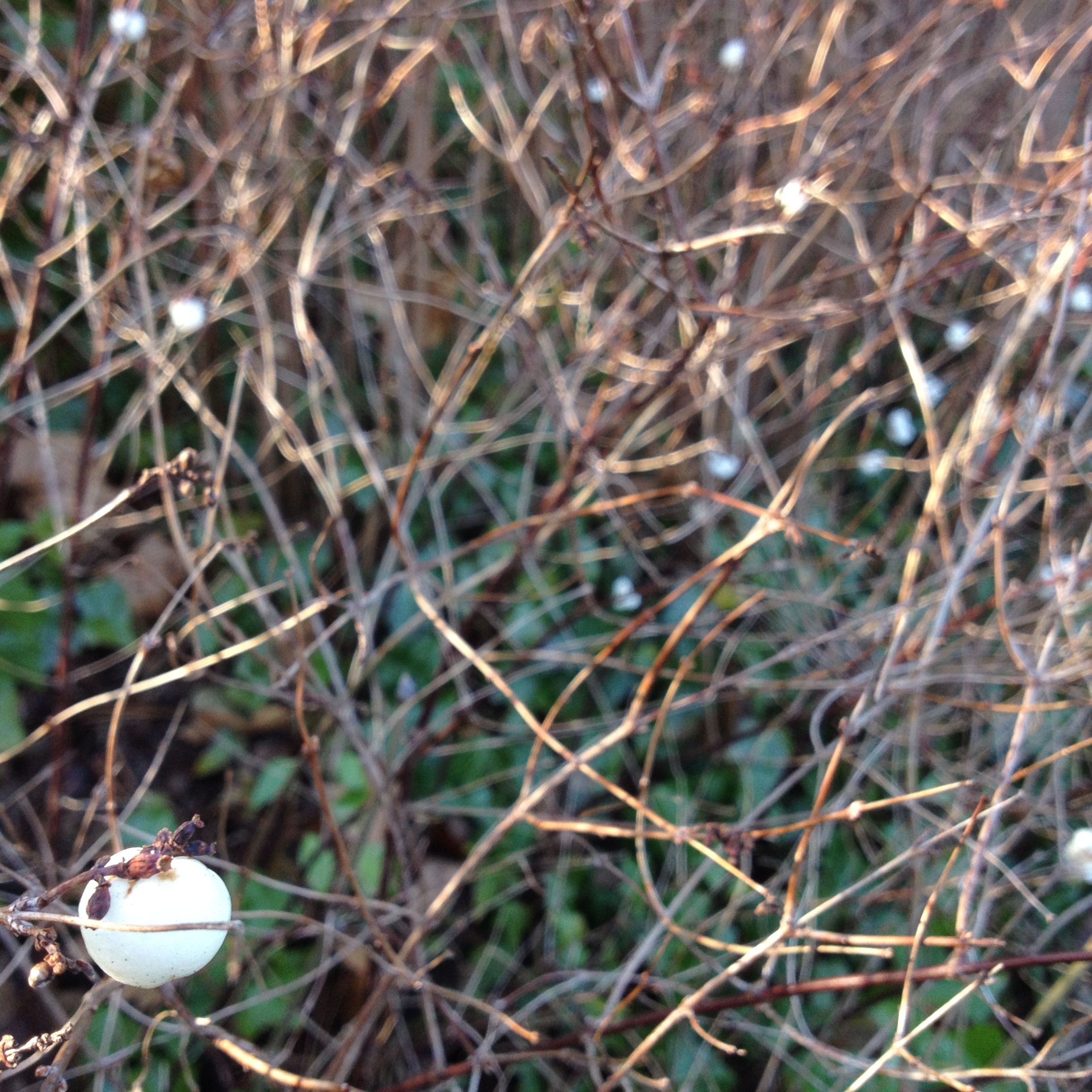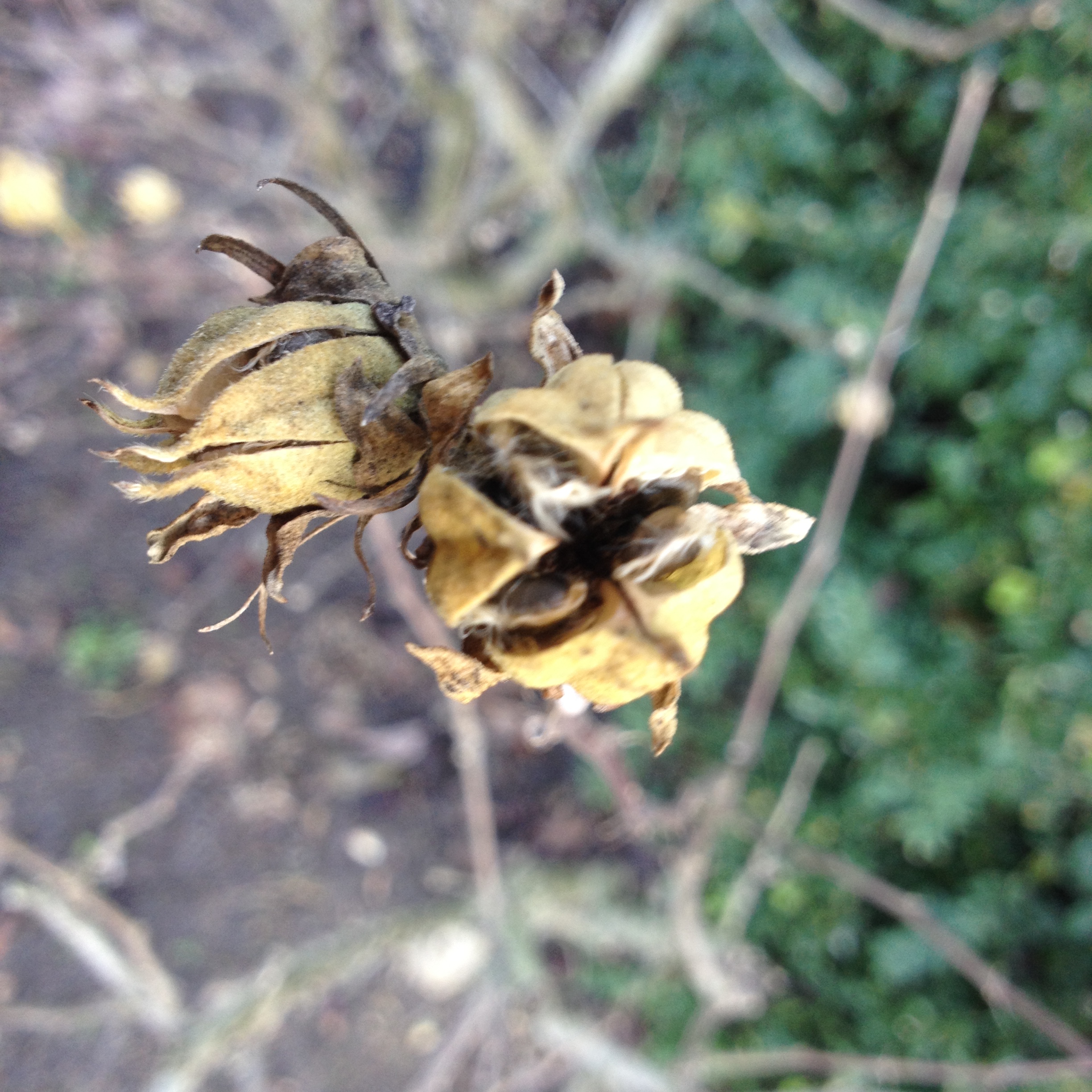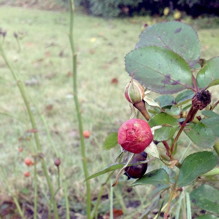 Meine kleine späte Rose ist längst verblüht; die letzte Knospe war nicht mehr aufgegangen, an den anderen Zweigen stehen Hagebutten.