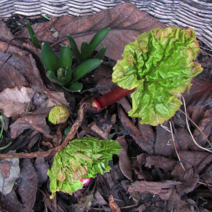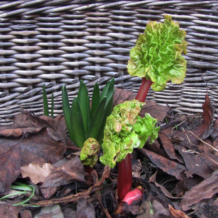 Es ist leider nicht mein Rhabarber, sondern eine Nachbarin hat in einem alten Wäschekorb auf der Straße ein „Beet“ eingerichtet und dort u.a. den Rhabarber gepflanzt. Er wächst dort frei und fröhlich vor sich hin. Allerdings ist es in der Innenstadt einer Großstadt ja deutlich wärmer als draußen auf dem Land. Da müsste man ihn wohl abdecken, wenn er schon so früh treiben soll.