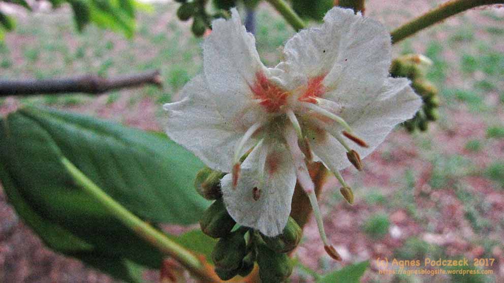 Zum Vergleich dazu nochmals frische Bilder vom Kastanienbaum. Diese Blüten sehen wirklich anders aus, nicht nur der Farben wegen. Die meisten Knospen der Kastanienblüten sind noch immer geschlossen, aber die fünffingrigen Blätter sind schon riesengroß.