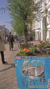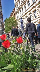 Außerdem ein Spaziergang durch die Oderberger Straße, die vor Touristen fast bersten wollte. Ich kann es ihnen nicht verdenken, denn die Straße ist gerade im Frühling und im Sommer besonders schön. Ein Blumenkübel reiht sich an das nächste Beet; die Mehrzahl ist wohl von Café- und Restaurantbetreibern angelegt, die natürlich an einer hübschen Gestaltung der Straße ein sehr leibliches Interesse haben.