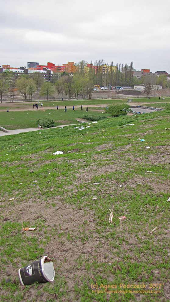 Als Schlusswort ein Beispiel dafür, wie ich positives Denken trainiere: Letzten Montagmorgen bin ich erneut durch den Park gelaufen und wollte sehen, wie sehr er durch das bunte Treiben in Mitleidenschaft gezogen wurde. Der Morgen war kühl und grau. Dort, wo gestern noch die Bands spielten, machten heute ein paar Mütter ihre Rückbildungsgymnastik. Am Rande saß ein Obdachloser, noch in seinem Schlafsack gewickelt. Die Flaschensammler waren wohl in der Nacht noch umhergegangen, denn Pfandflaschen lagen keine mehr herum. Und ja, die Wiese war vermüllt, aber nicht so schlimm, wie ich es befürchtet hatte. Von den vielen tausend Besuchern hat die überwiegende Mehrzahl ihren Müll mitgenommen. Das ist doch ein gutes Zeichen, oder?