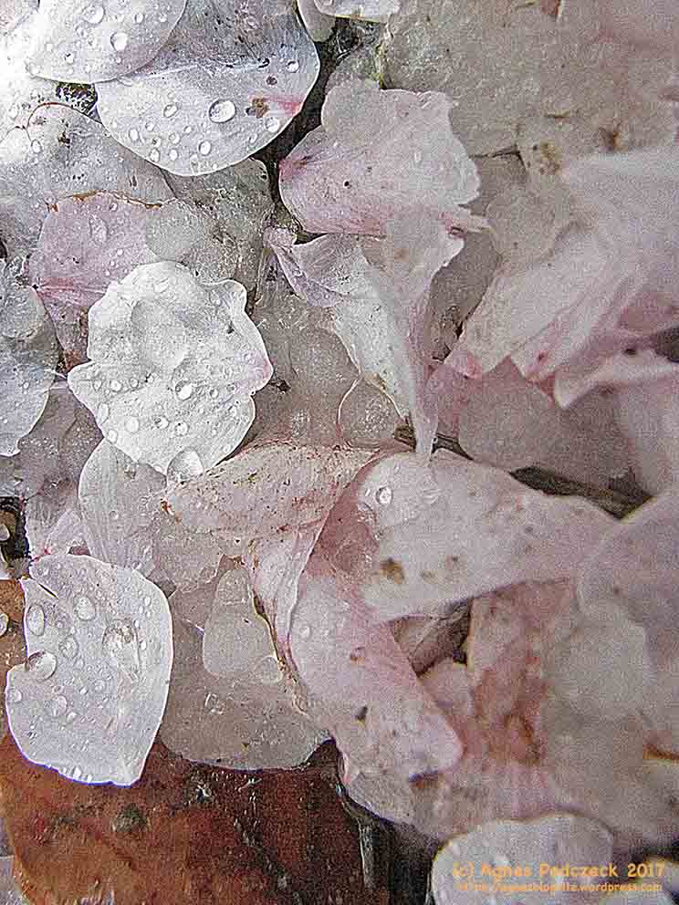 20170416_Sonntag05 April 16, 2017 Rhabarber und Hyazinthe 11 – Das Ende 744 × 992 Nach der heutigen Hagelhusche glitzern die Blütenblätter – am Baum und auch am Boden – in der Aprilsonne.