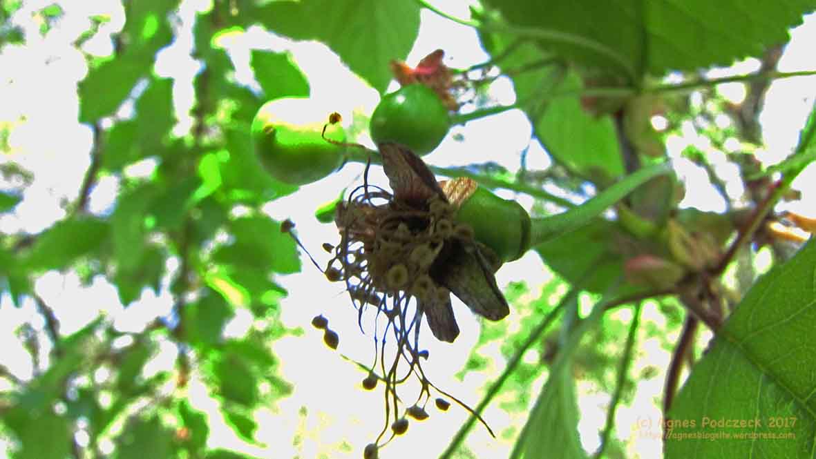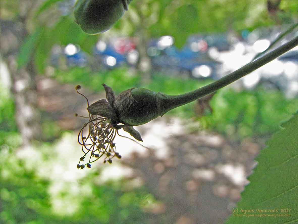 Die abgeblühten Kirschbäume südlich der Bornholmer Brücke hingegen tragen zu meinem riesigen Erstaunen sogar Fruchtansätze. Wieder muss ich zugeben: Jahre schon wohne ich in dieser Gegend, unzählige Male bin ich diesen Weg gegangen. Aber dass es sich hier um tragende Bäumchen handeln könnte, auf diese Idee war ich noch nie gekommen.