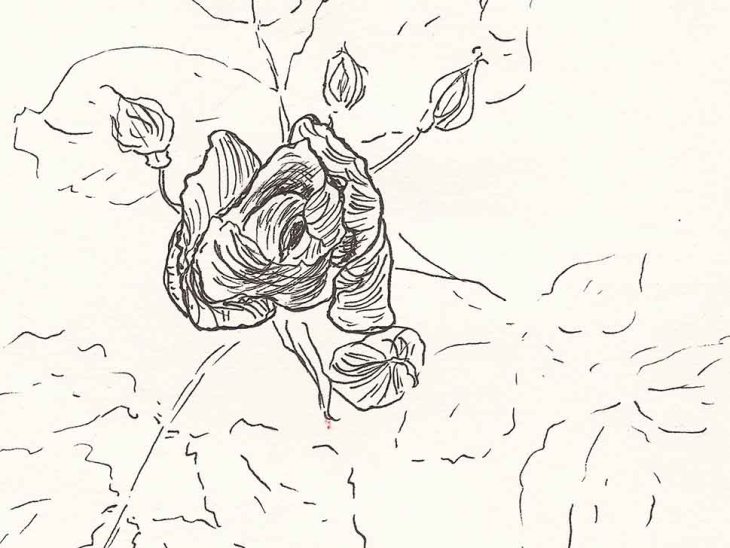 Stattdessen zeige ich drei kleine Rosenskizzen, die ich mit Fineliner in mein A5-Skizzenbuch gezeichnet habe. Ich will es demnächst doch mal mit Feder und Tusche versuchen, was draußen wohl aber schwierig wird.
