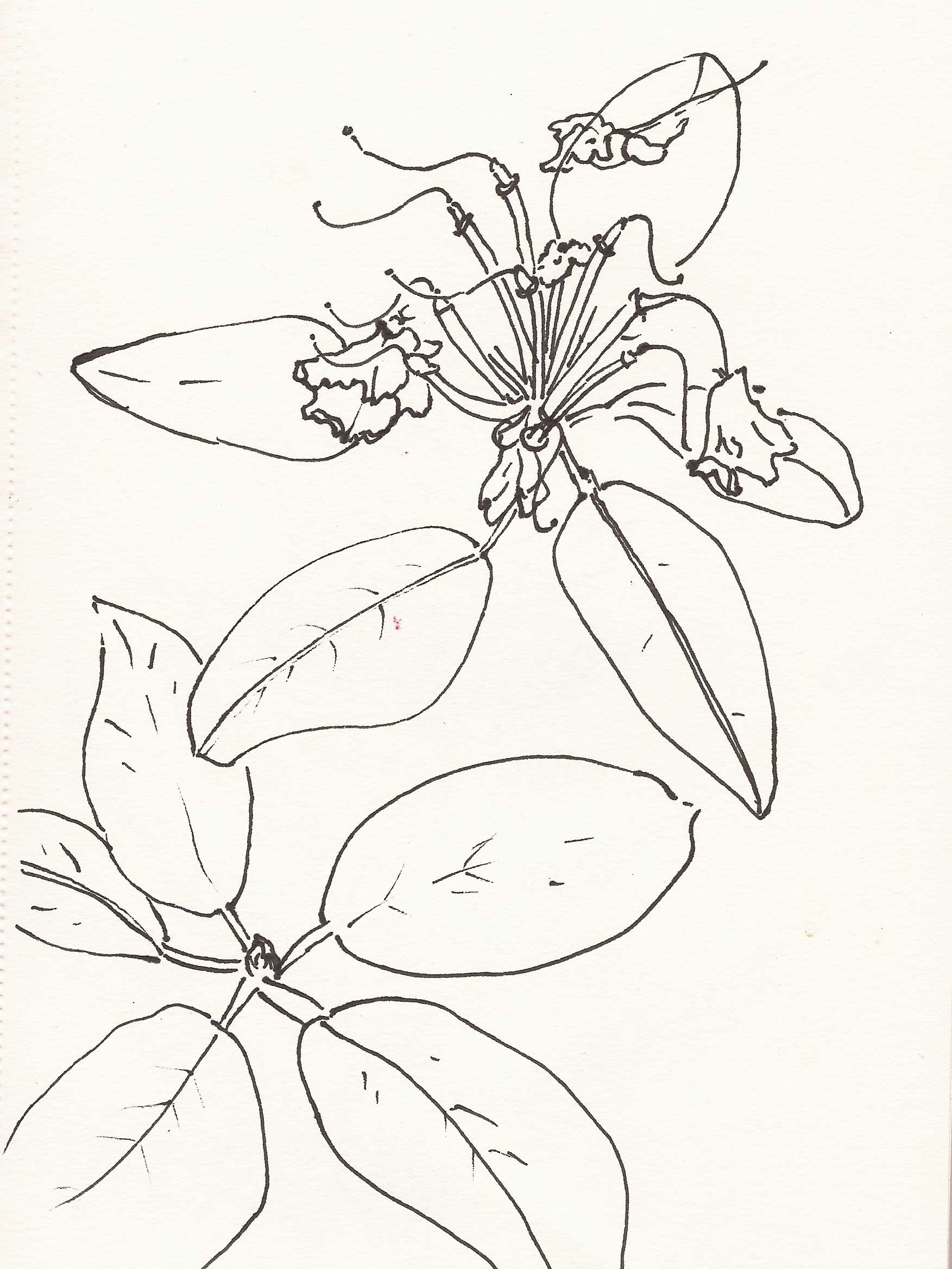 20170608_Rhododendron Juni 9, 2017 Zwei kleine Draußenskizzen 1753 × 2337 Rhododendron nach der Blüte, Skizzenbuch A5, Fineliner, 08.06.2017, (c) Agnes Podczeck