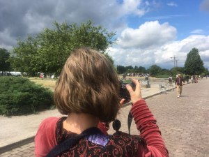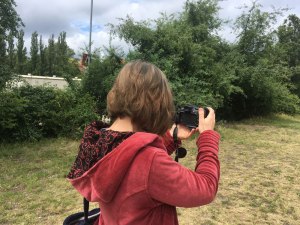 Am Sonntag schlenderten W und ich wie üblich den Mauerpark entlang. Ich trödelte, blieb überall stehen, sei es, um die Vorbereitungen für ein Straßen(Park-)konzert festzuhalten, die Wolkenformationen abzulichten oder mich in die Flora am Rand der inzwischen trocken-gelben Parkwiese zu vertiefen. So merkte ich zunächst nicht, dass W unterdessen seinerseits die Gegenperspektive einnahm und im gleichen Augenblick wie ich auf den Auslöser drückte, nur diesmal die Motivfängerin ins Objektiv nahm.