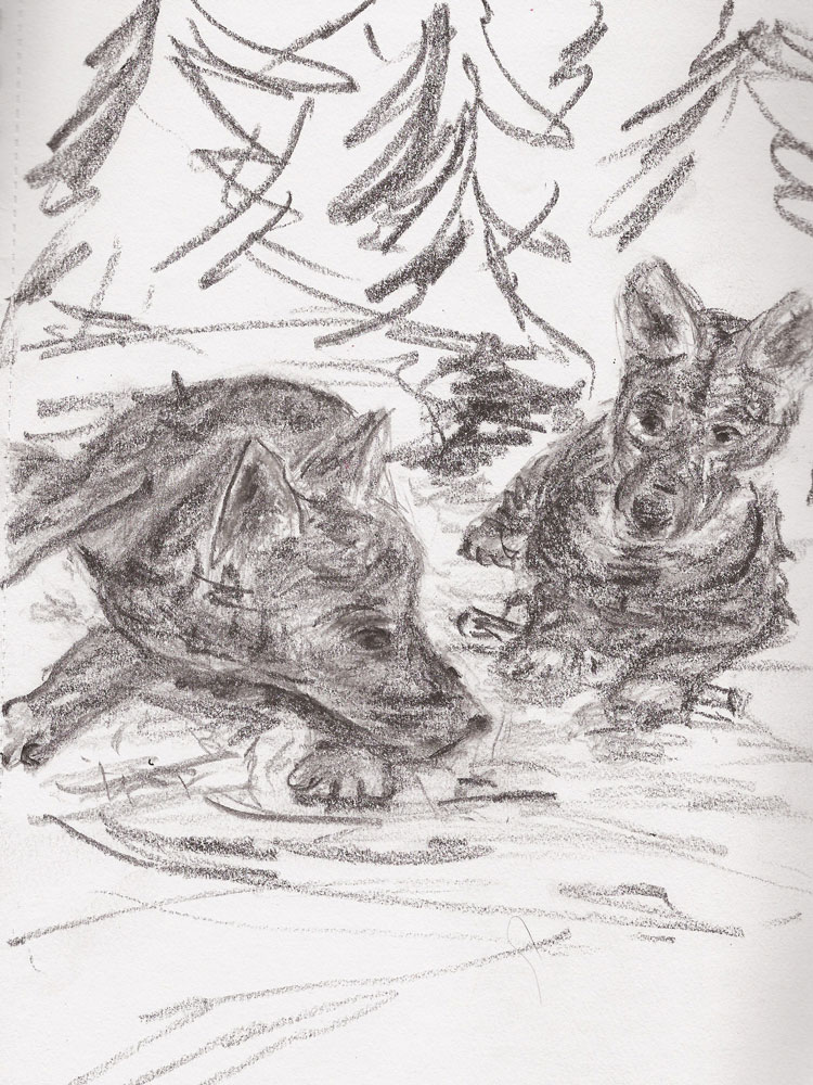 20170713_WoelfeBG Juli 13, 2017 Ailaf, Marina und Mayaa … 750 × 1000 Jungwölfe beim Spiel, Skizzenbuch A4, Bleistift und Grafit, 13.07.2017