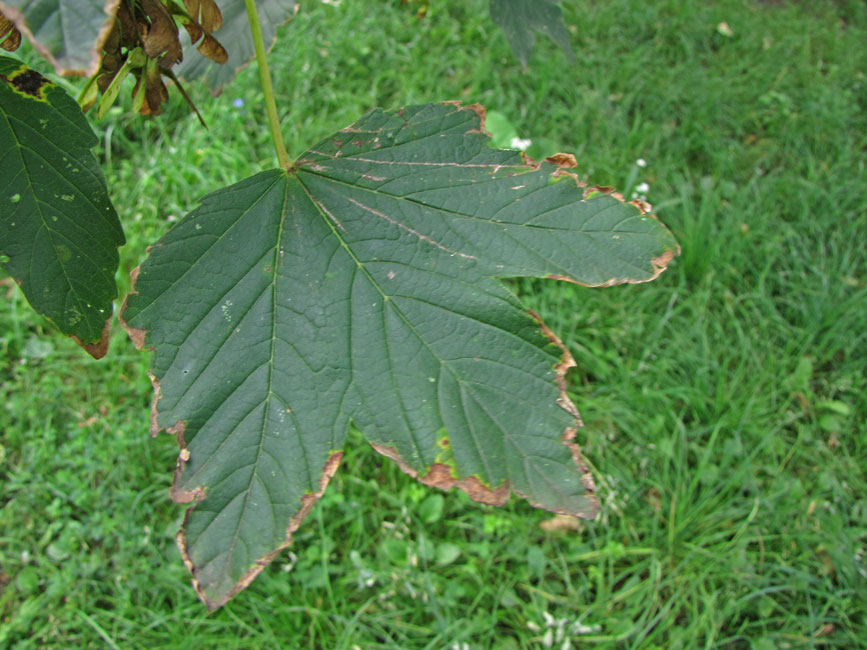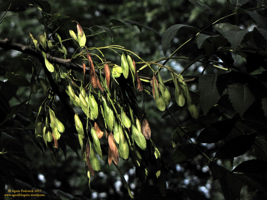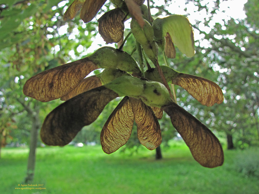 Die Früchte des Ahorns beginnen abzutrocken und seine Blätter bekommen einen kleinen welken Rand.
