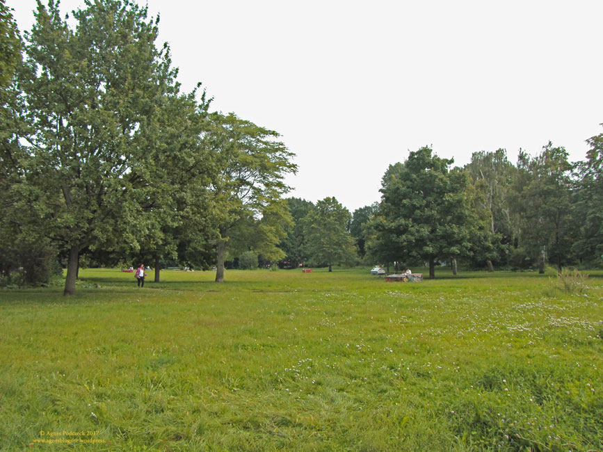 In diesem Jahr war der Sommer in Berlin weniger heiß, dafür aber sehr feucht und so sind die Wiesen in den Parks auch zum Ende des Sommers noch erstaunlich grün, das Gras steht teils dicht und hoch. Sogar nahe des viel belaufenen Mauerparks, am Falkplatz. Aus der Ferne betrachtet wirkt der Park noch sommerlich.