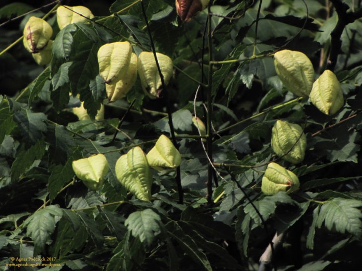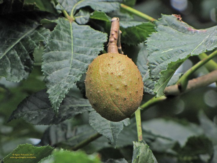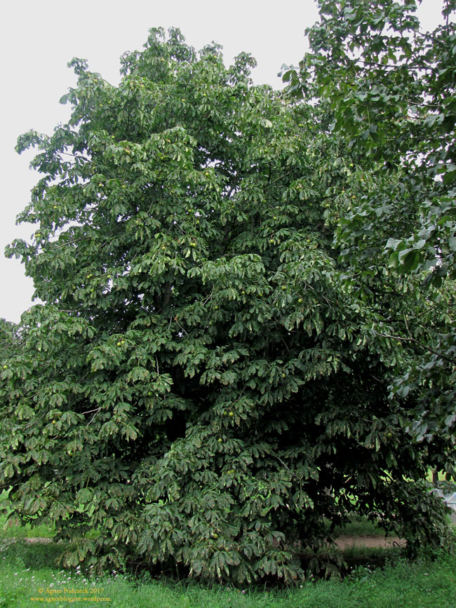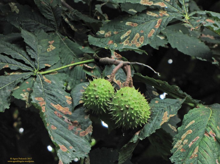 Sichtbarstes Zeichen für den sachte ankommenden Herbst: die Kastanien, deren Blätter schon sichtlich welken. Die großen Rosskastanienbäume, die im Sommer zartrosa und weiß blühten, hängen über und über mit Früchten. Die sogenannte Edelkastanie – die Rotblühende Rosskastanie – zeigt hingegen nur sehr wenige und sichtbar verschiedene Früchte.