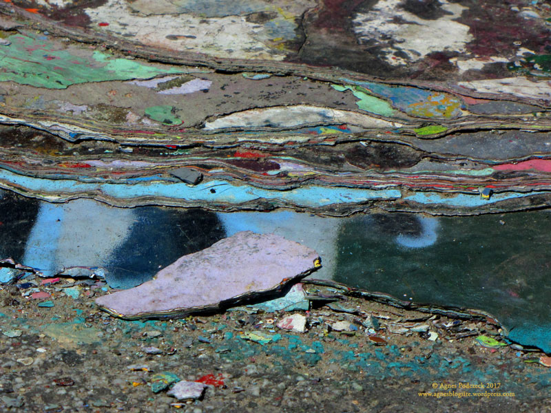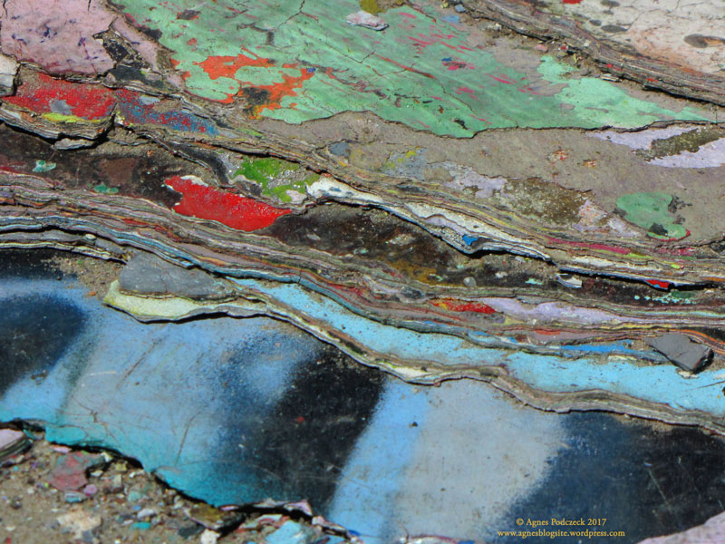 Streetart ist kurzlebig. Schicht für Schicht werden alte durch neue Motive übermalt und so entsteht mit der Zeit eine dicke Lackschicht, die sich in großen Flatschen von der Mauer löst.