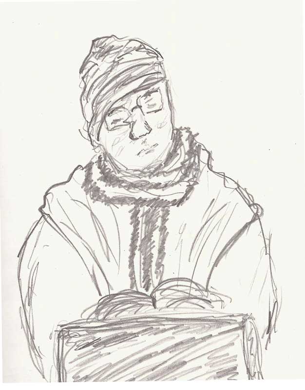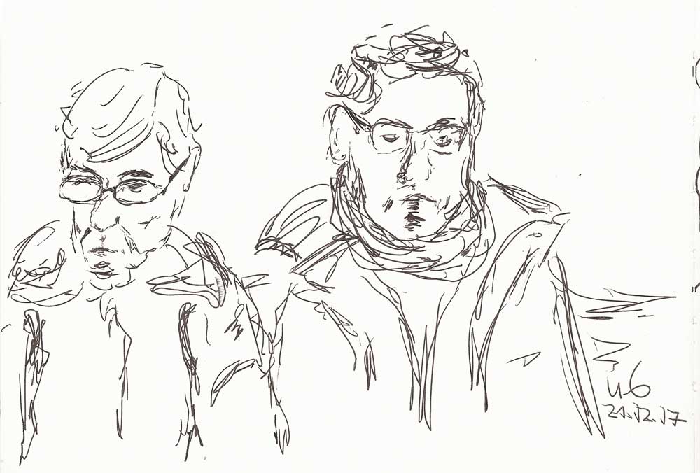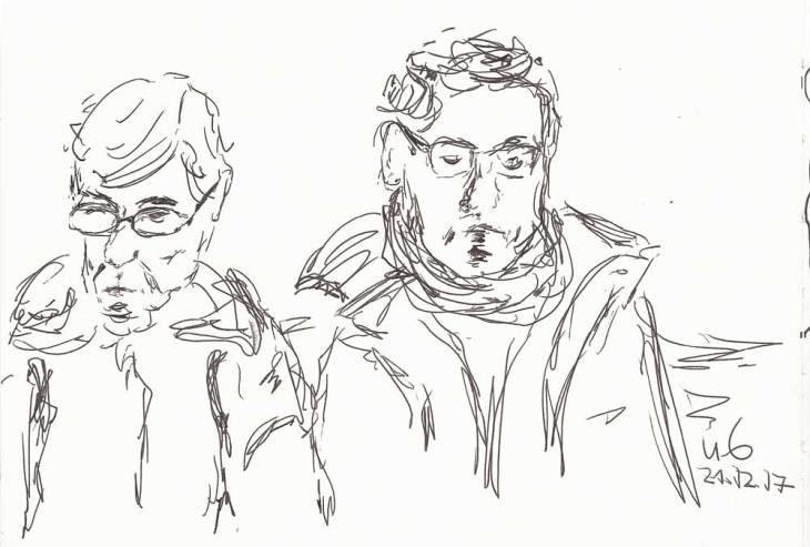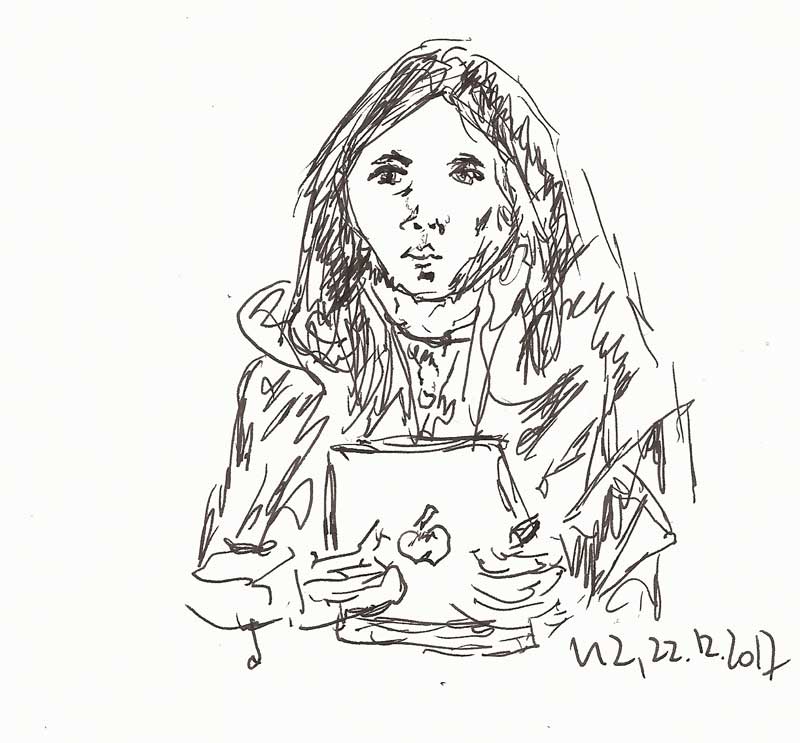 Heute haben in der S-Bahn bzw. später in der U-Bahn gleich zwei Menschen ihren Laptop aufgeklappt. Das sehe ich auch nicht allzu häufig. Eine Skizze hierzu gibt es nicht, nur eine alte Zeichnung aus dem Dezember einer jungen Frau mit i-Pad. Auch die beiden anderen Skizzen sind aus dem Vormonat. Die heutigen Bilder einzuscannen bin ich zu faul. Als Zugabe für alle, die vergessen haben, dass auch im Winter mal die Sonne scheinen kann, noch eine kleine Selfie-Spielerei vom Montag.