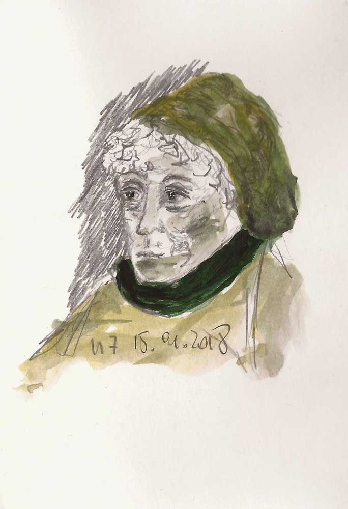3. Ich empfinde es wie Gerda und Birgit, die Farbe gibt den Skizzen Kraft und Ausdruck, bei mir ist es das erste und das drtte Portträt, die mich sehr ansprechen. Außerdem denke ich an U-Bahn-Fahrten am Morgen durch Berlin…