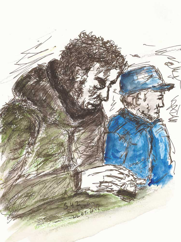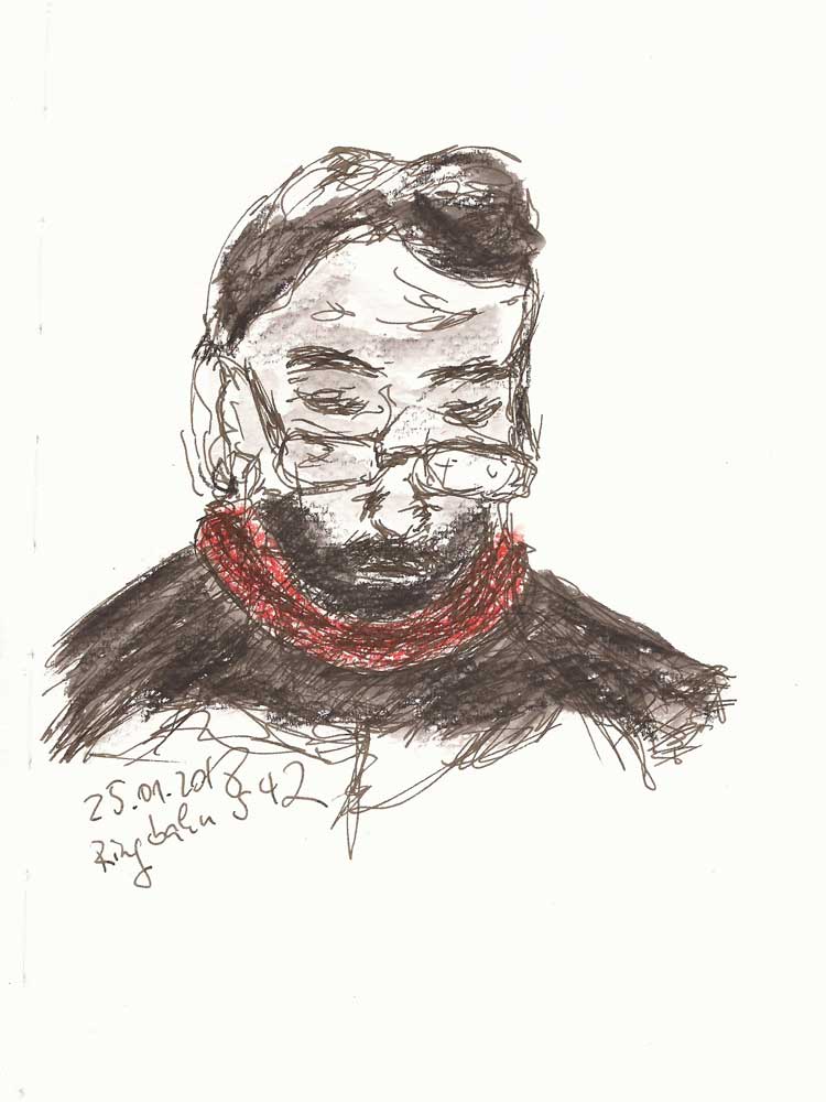 Die zweite Zeichnung entstand am Montag und auch hier dachte ich, Euch ein Vorher und Nachher zeigen zu können – allerdings hatte ich wohl den Überblick verloren und genau diese Zeichnung zu scannen vergessen. Hier finde ich die Farbe besonders passend, die beiden unterschiedlichen Personen auf der S-Bahn-Bank voneinander abzuheben / abzugrenzen.