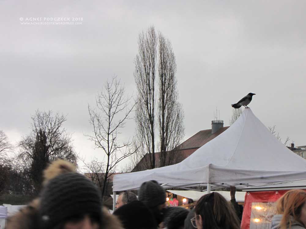 An den blühenden Ziermandeln kann ich mich hingegen weniger erfreuen. Haben sie seit November ununterbrochen geblüht? Über dem Falkplatz zetern die Krähen. Selbstbewusst flattern sie von Ast zu Ast und auch über dem Sonntäglichen Flohmarkt spähen sie nach Essensresten. Ob die Rabenvögel die heimlichen Herrscher der Stadt sind?