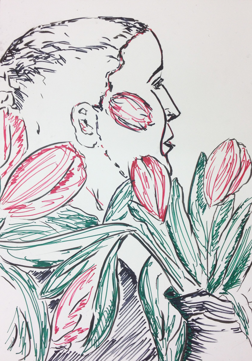 20180306_Portrait1BG April 19, 2018 Portraitzeichnen – Frau mit Tulpen 838 × 1200 Frau mit Tulpen, Filzstifte, A3-Papier, 06.03.2018