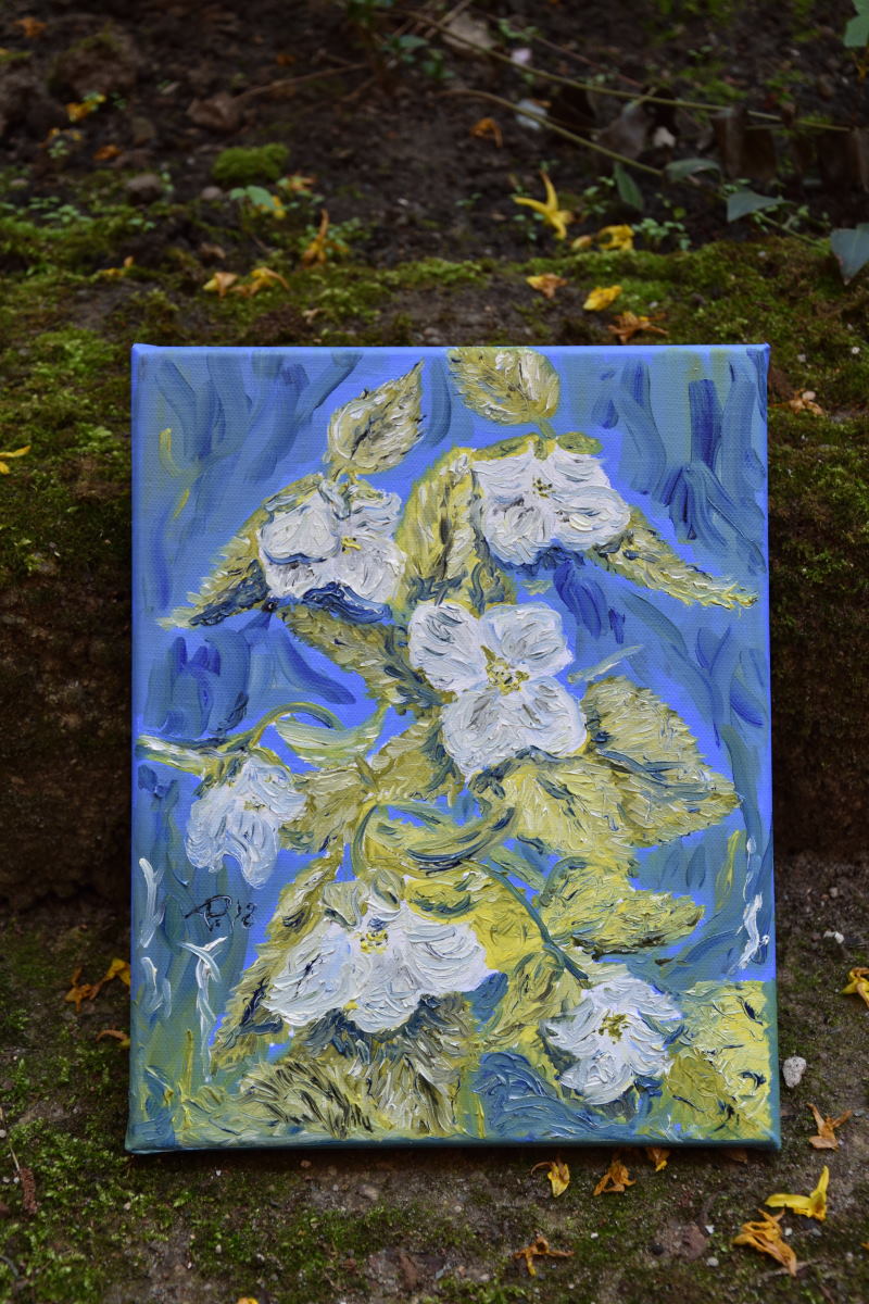 Ein gefundener Blütenzweig diente mir als Motiv, von dem ich mich im Laufe der Bildentstehung allerdings etwas löste. Jetzt bekommt die teils dicke Farbe ein paar Tage zum Trocknen, dann werde ich sehen, ob ich die eine oder andere Stelle noch etwas nachbearbeite.
