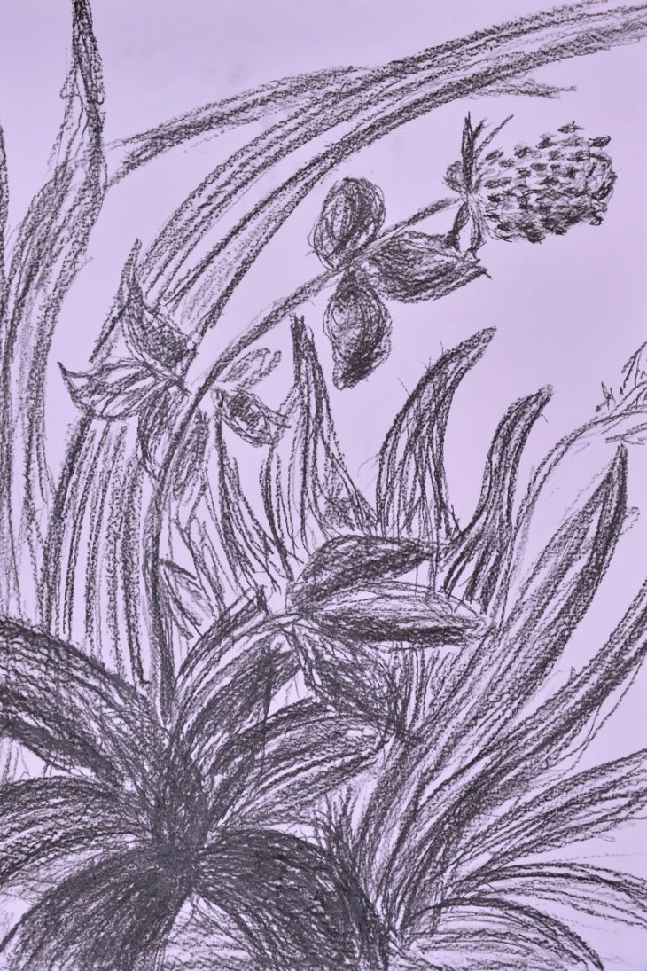 Derzeit zeichne ich während der Therapiestunden, was mir spontan an jenem Tag so in den Sinn kommt. So etwa die Studie meiner Hand und eines Globus (das war am sogenannten Erdüberlastungstag) oder aber die Zeichnung „Im Dickicht“, wo ich meine Anspannung in den Schwung des dicken Kohlestiftes legen konnte, inspiriert von einer Kleeblüte, die ich auf dem Weg ins Atelier pflückte.