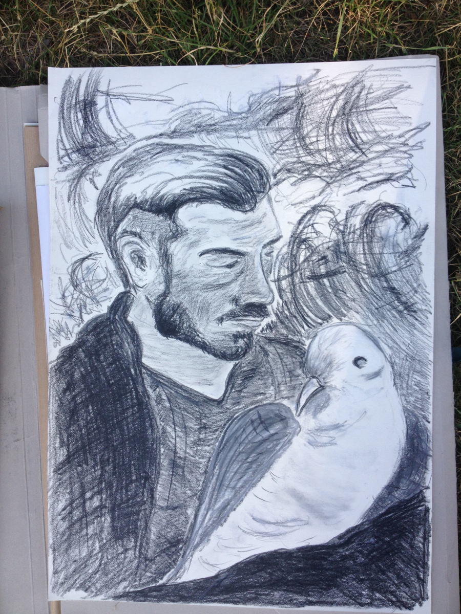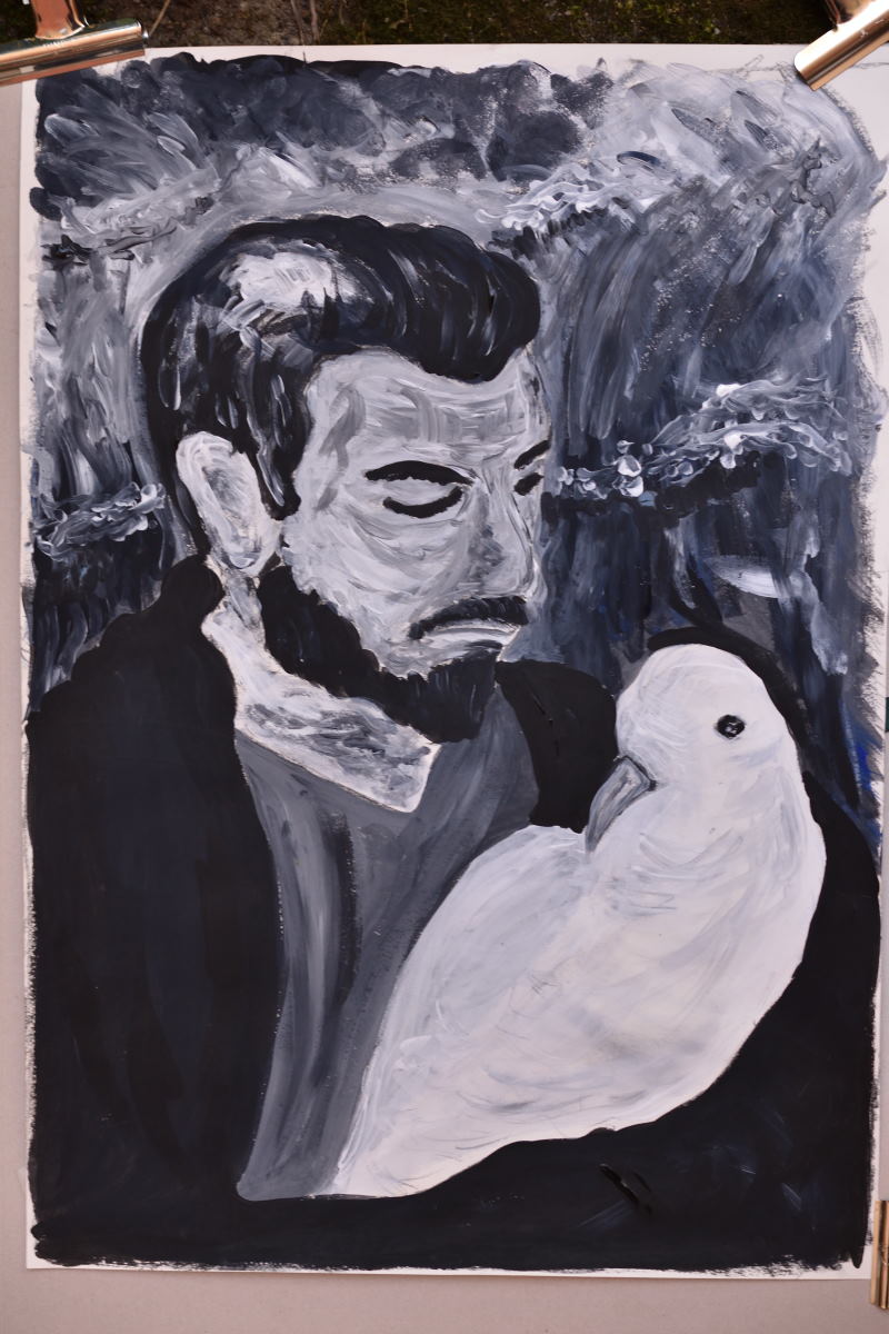 Das Modell war ein sanft aussehender junger Mann mit deutlich russischem Akzent, dem die Kursleiterin für ein Doppelportrait eine ausgestopfte Möwe in die Hand drückte. Ich musste sofort an Tschechow denken, aus dessen Stücken oder Erzählungen das Modell durchaus hätte entspringen können und hätte ich in jenem Moment Lust am Spiel mit dem Klischee gehabt, hätte ich ihn in eine Birkenlandschaft gesetzt.