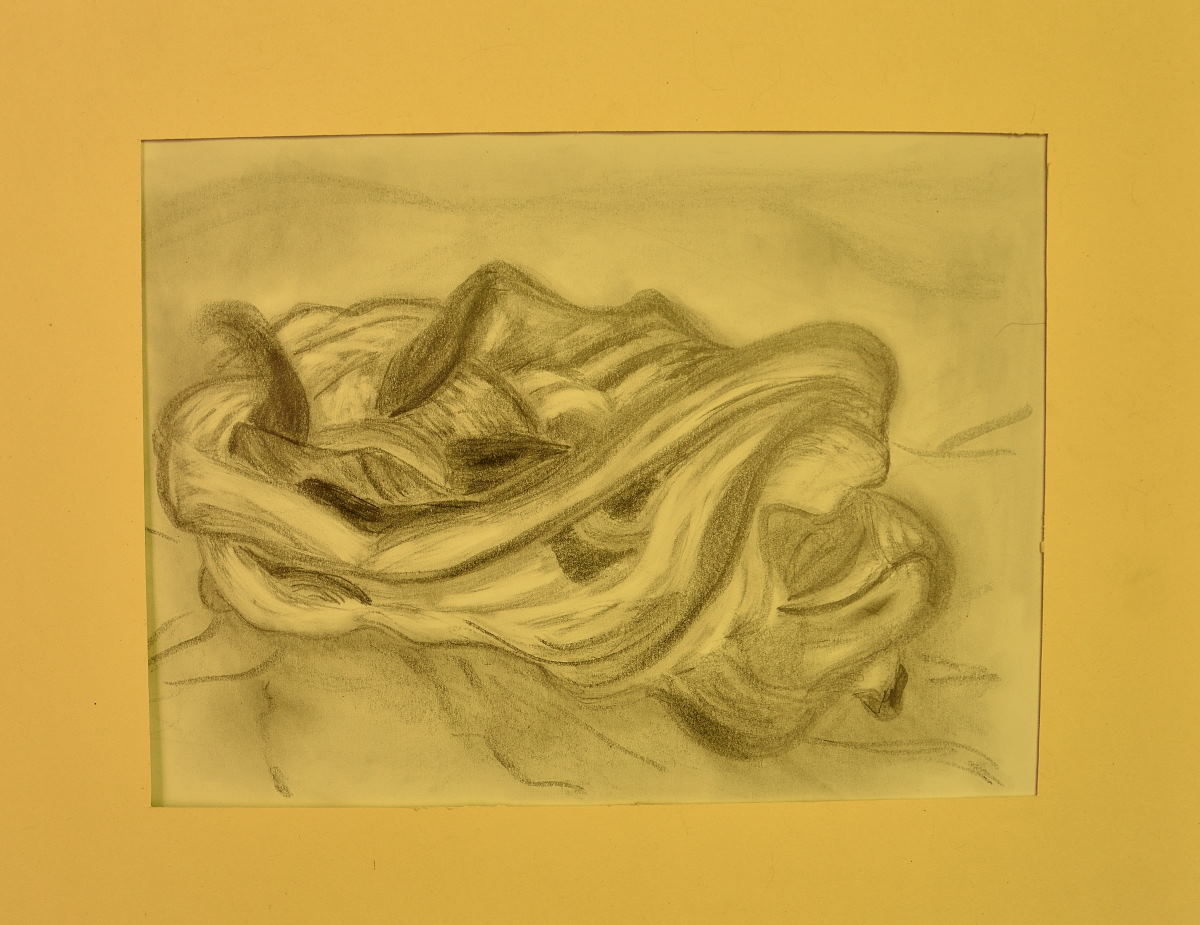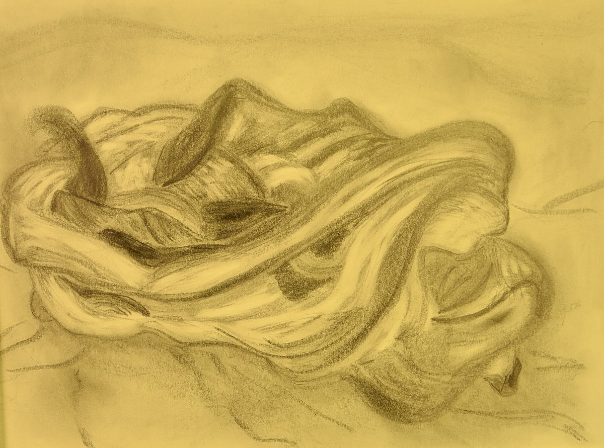 Nach zwei Wochenenden in Folge, an denen ich Dinge bewältigt und an sozialen Aktivitäten teilgenommen habe, die ich mir sehr lange nicht mehr zugetraut hatte – ich werde noch voller Stolz davon berichten -, darf ich mir wohl zugestehen, dass ich dieser Tage nicht ganz das blühende Leben bin. In der Ergotherapie habe ich mich heute daher einfach nur daran erfreut, den weichen Bleistift immer wieder über das Papier streifen zu lassen, Strich für Strich und verschlungene Linie zu setzen, zu verwischen und erneut mit dem Bleistift über das Papier zu gleiten. Inspiriert hat mich dabei mein schwarzes Tuch, das ich vor mich auf den Tisch legte. Aber schon nach kurzes Zeit schon improvisierte ich und ließ mich von mir selbst überraschen, welch eine Tuchlandschaft entstand.