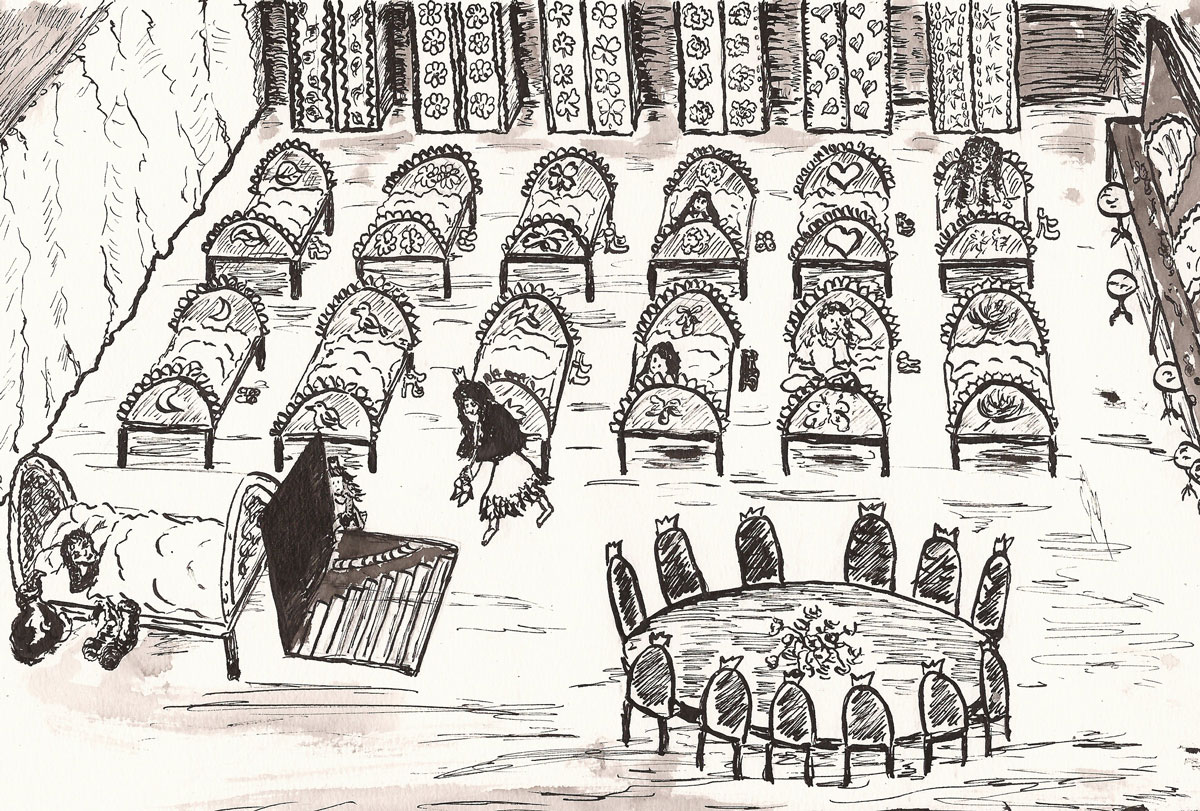 das ist wieder ein ganz und gar spannend erzähltes Märchen, und die Illustration dazu fabelhaft. Diese Bettchen, diese Schränke, diese Schminkspiegel, diese zwölf Stühle um den runden Tisch, diese Falltür über der Treppe – und die Prinzessin, die sich, die Schuhe in der hand, zu ihrem Helden schleicht – es ist einfach fantastisch, was du da machst!