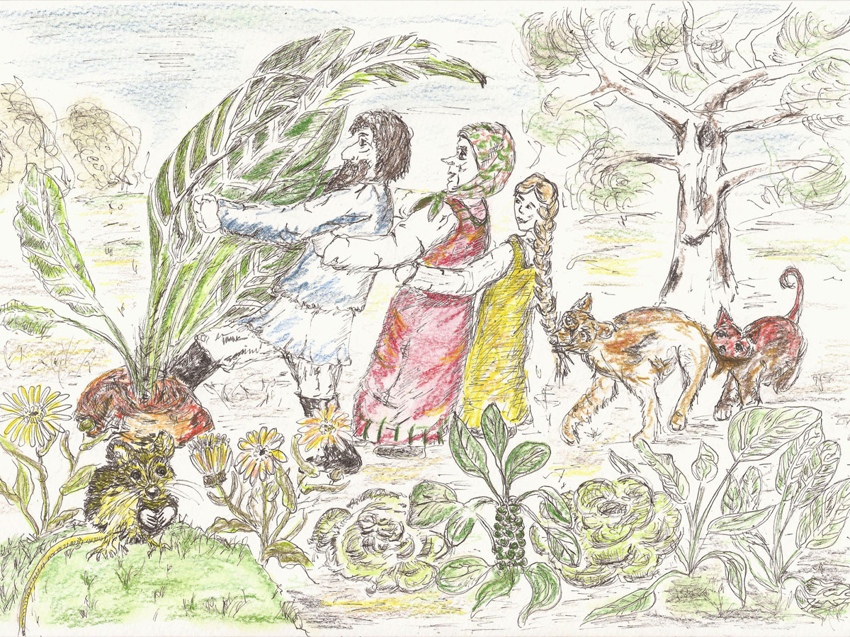 Da hielt die Katze dem Mäuschen ihren Schwanz hin. Das Mäuschen packte die Katze, die Katze hielt sich am Hund, der Hund zog am Zopf der Enkeltochter, diese umfasste die Großmutter und die Großmutter fasste den Großvater. Sie zogen und zogen und zogen. Und auf einmal hatten sie das Rübchen aus der Erde gezogen. Sie plumpsten auf die Erde und freuten sich.