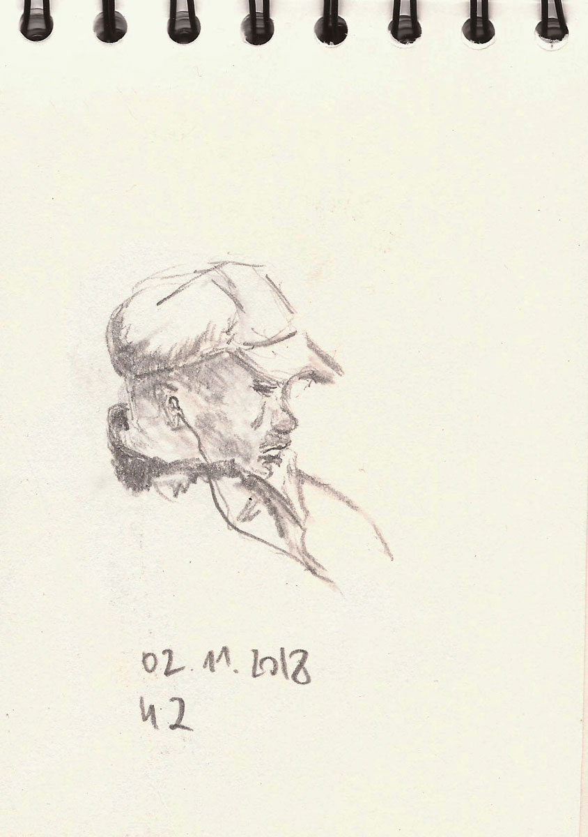 20181102_s-bahn-1BG November 3, 2018 S-Bahn-Skizzen (43) – Zurück 844 × 1200 Mann in der U-Bahn, gezeichnet von Agnes Podczeck, Skizzenbuch A6