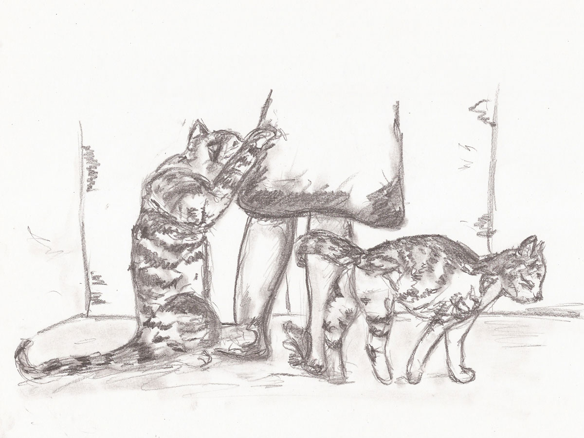 Katzen warten auf ihr Frühstück, Zeichnung November 4, 2018 Alltag (1) – Bevor der Tag beginnt 1200 × 900 Sonst eher wie Hund und Katz, schleichen sie während der Fülung der Näpfe in trauter Eintracht um die Beine ihres Menschen herum.