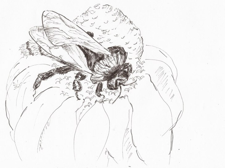 Dieses interessante Wesen sah ich Anfang August in Schöneberg, mitten in Berlin und kurz nach einem in diesem Jahr ach so seltenen Regenschauer. Dunkel, länger und schlanker als eine Hummel, die Flügel braun getönt und mit einem bübschen Haarkranz um den Hals erweckte es sofort meine Aufmerksamkeit. Leider hatte ich nur das Handy zum Fotografieren dabei.