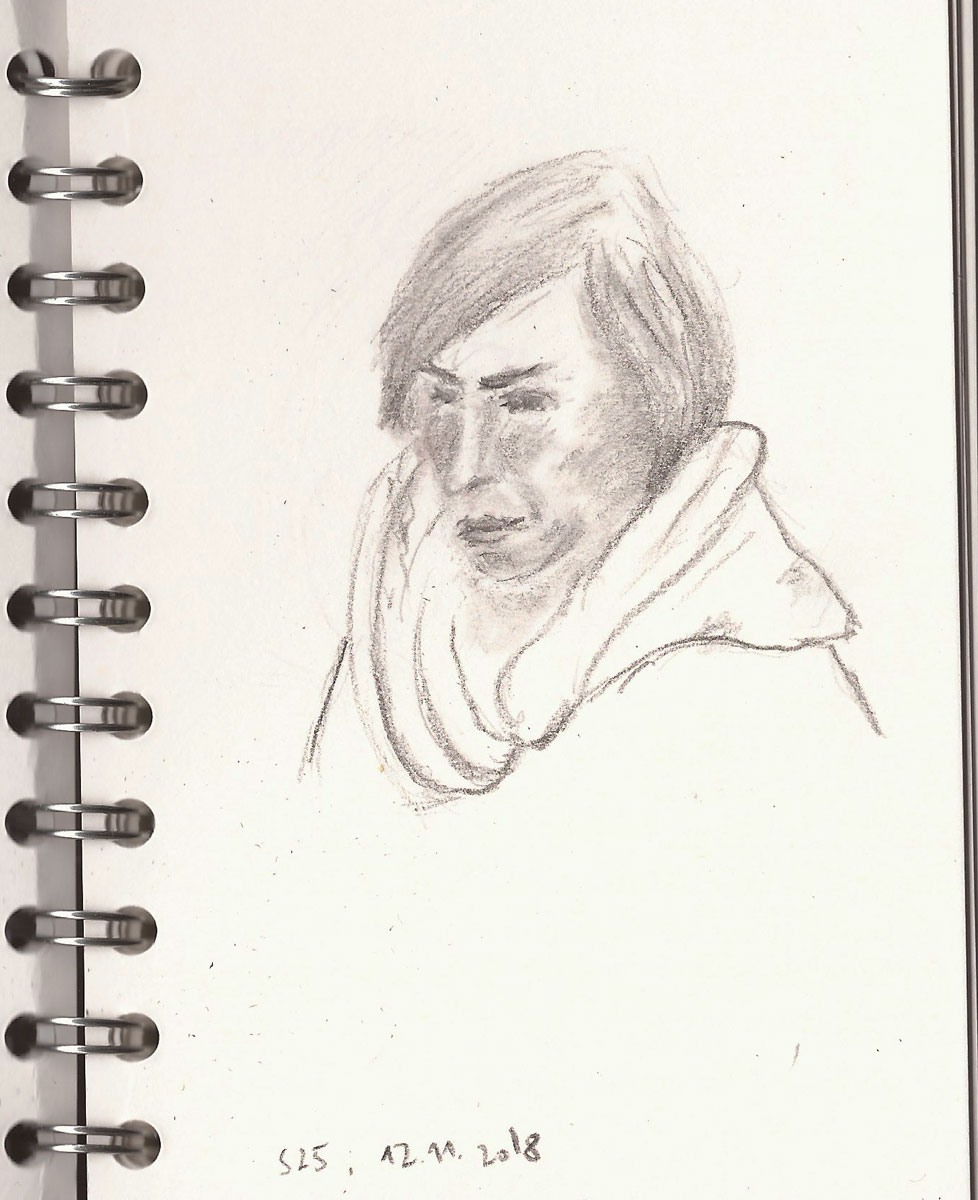 In jüngster Zeit schwelge ich in der S- oder U-Bahn auch mal dem süßen Nichtstun, habe die Augen geschlossen oder gucke aus dem Fenster (falls ich nicht unterirdisch fahre). Manchmal sind die Bahnen auch so voll, dass ein entspanntes Zeichnen nicht möglich ist. Am Donnerstag habe ich mal wieder gestaunt, wie langmütig wir Berliner*innen dem äußeren(!) Anschein nach sein können. Gleich zwei Mal steckte ich in einer vollen U-Bahn fest, die sich plöztlich und erklärungslos nicht mehr vom Fleck bewegte. Niemand zuckte auch nur die Wimper, gefühlte zehn Minuten lang. Erst am nächsten Bahnhof dann wurden die Ellbogen ausgepackt. Mensch wollte aus der Bahn oder sich in die Bahn ganz dringend noch hineinstapeln; und das zog sich dann entsprechend hin. Dann endlich die mürrische Stimme des Fahrers: Die nächste Bahn kommt in EINER Minute (Subtext: Von der Tür, Ihr Deppen!). Und die Menschen ließen ab.