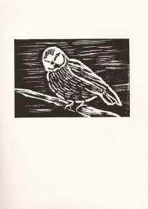 Vogel auf Ast, Linolschnitt A6, Druckfarbe schwarz, Dezember 2018