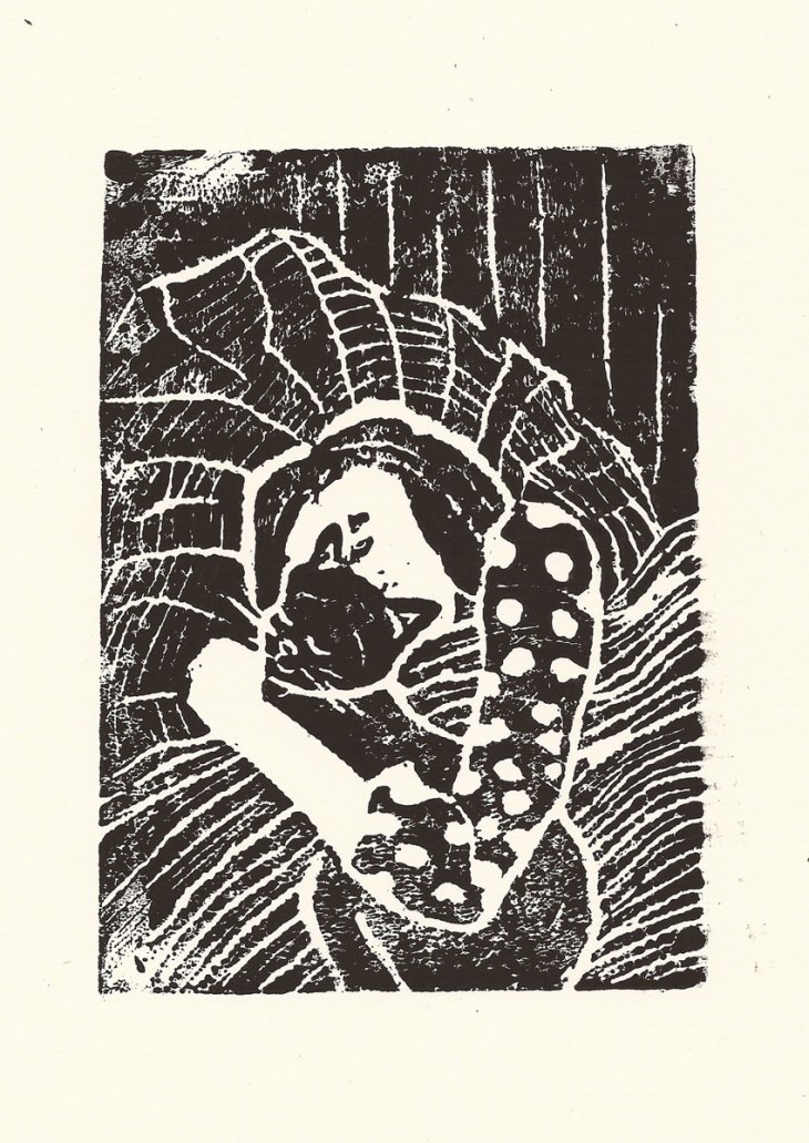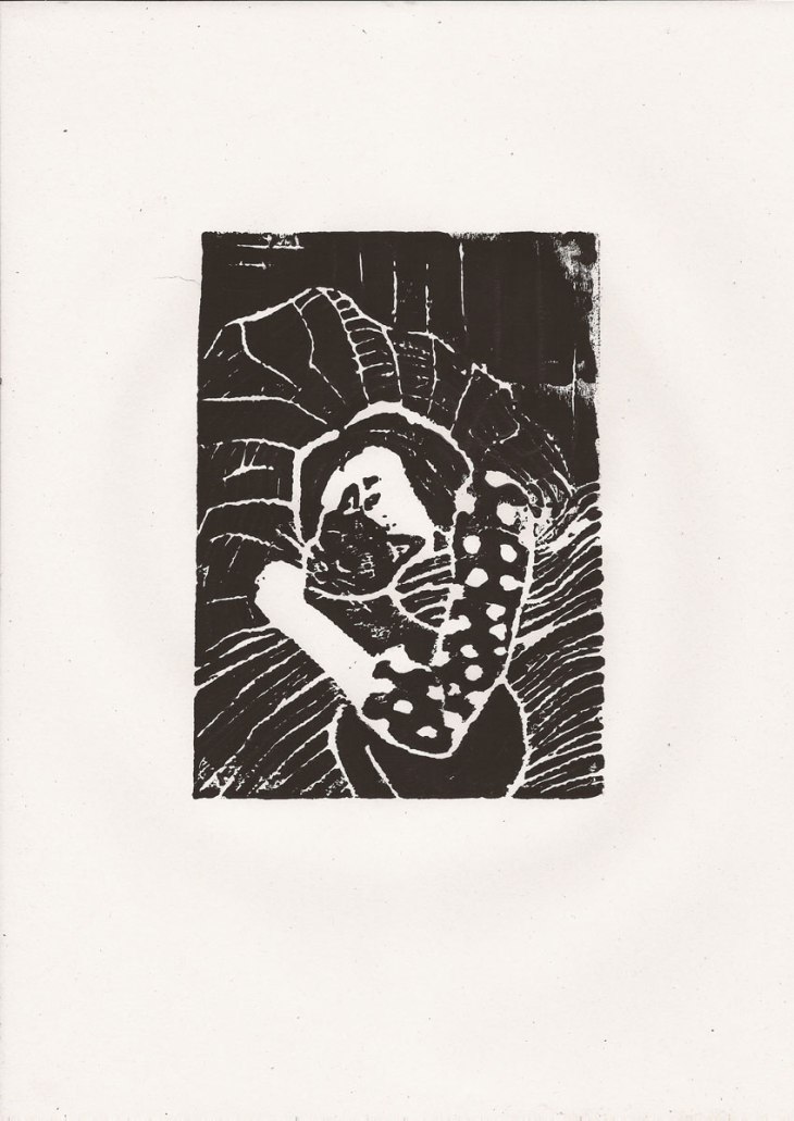 Das Motiv meiner Zeichnung von vorgestern (Schlafendes Kind umarmt Katze, siehe >>HIER<<), habe ich jetzt auch als Linolschnitt ausgearbeitet (Größe der Platte ca. A6). Langsam fällt es mir leichter, mit dem Scheidewerkzeug umzugehen und Feinheiten herauszuarbeiten. Der Rat von Marina, die Linolplatte auf die Heizung zu legen, erweist sich außerdem als hilfreich. Danke dafür.