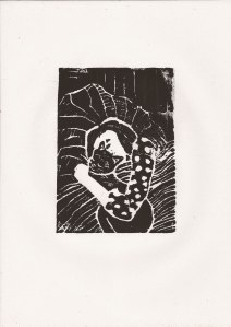 Kind und Katze, Linolschnitt, A6, gedruckt auf A4-Papier, Dezember 2018