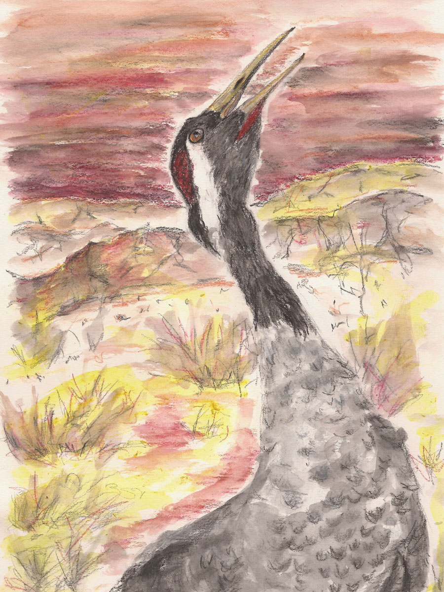 20181114_KranichBG November 14, 2018 900 × 1200 Das Lied des Kranichs. Zeichnung von Agnes Podczeck, November 2018, Format A4, Aquarellbuntstifte