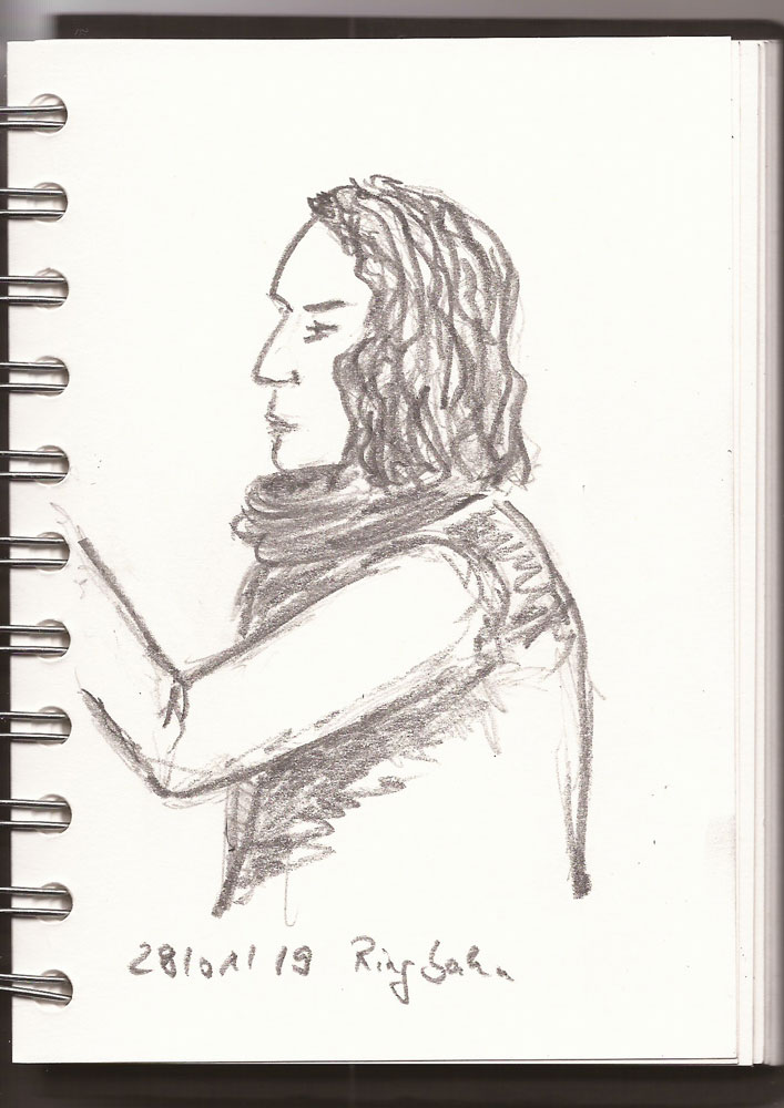Die Menschen, die ich hier sehe und zeichne, setzen sich nicht extra in Position, halten nicht still, oder steigen aus bevor ich die Zeichnung beendet habe. Dann beende ich die Zeichnung nach Gedächtnis und/oder Stimmung. Das ist etwas ganz anderes als das Zeichnen eines Modells im Atelier.