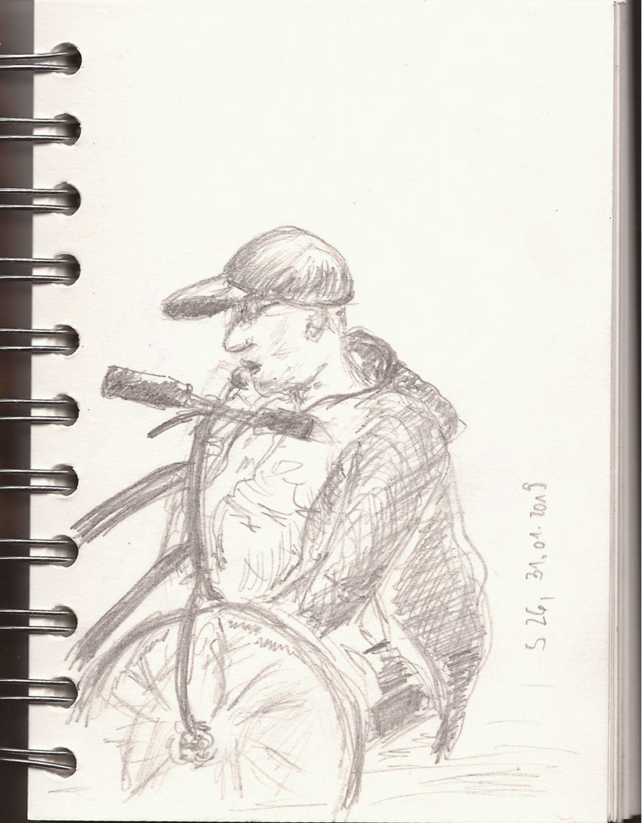 Faszinierend wie du darüber schreibst, dass sich dir durch den Wechsel vom Fahrrad in die S-Bahn ein neuer Kosmos erschlossen hat. Mir gefällt sehr, wie du über die dich beim S-Bahn-Fahren begleitenden Menschen schreibst; sie nicht als lästiges „Übel“ wahrnimmst, wie es häufig dem Gejammer derer entspricht, die auf die Öffentlichen angewiesen sind. Ich persönlich liebe das Radfahren zu sehr, als dass ich im Alltag auf die Bahn umsteigen wollte, obgleich es mir noch nicht gelungen ist, die am Verkehr teilnehmenden Menschen radelnd zu skizzieren ;-) Fahre ich ausnahmsweise doch mal mit der (Fern)Bahn, ist auch bei mir stets das Skizzenbuch gezückt. In Ermangelung dieser Gelegenheiten bin ich auf Instagram ausgewichen, da gibt’s Menschen zuhauf, die freilich alle stillhalten, was die Brisanz rausnimmt, und die Lebendigkeit beim Erfassen einer Person im Raum, so wie es deine Skizzen so schön wiedergeben! Viele Grüße!