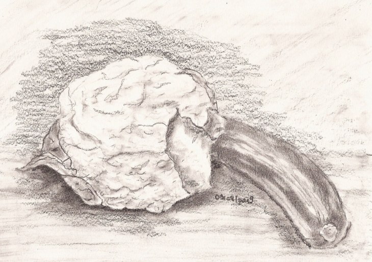 Bevor das Gemüse zubereitet und gegessen wird, muss es zuweilen als Zeichenobjekt dienen. Heute: ein Blumenkohl und Zucchini.
