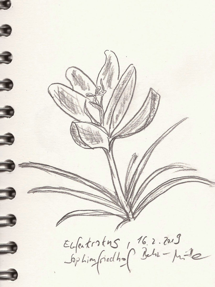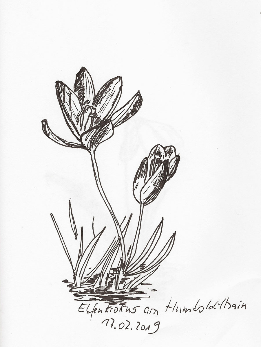 Was ich denn da mit dem Krokus vorhätte, erkundigt sich gestern eine ältere Dame, als ich auf dem Berliner Sophienfriedhof mit Bleistift und Skizzenbuch bewaffnet vor dem kleinen lila Elfenkrokus in die Knie gehe. Ja ja, sie hätte früher gedacht, bei diesen zarten Zwiebelpflanzen würde es sich um Herbstzeitlose handeln, doch nun wisse sie es ja besser. Innerhalb von zwei Tagen seien die hier alle aus der Erde gekrochen.