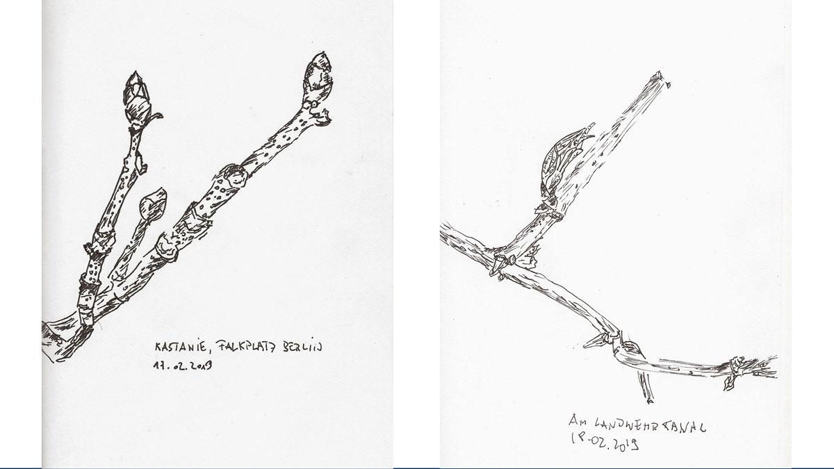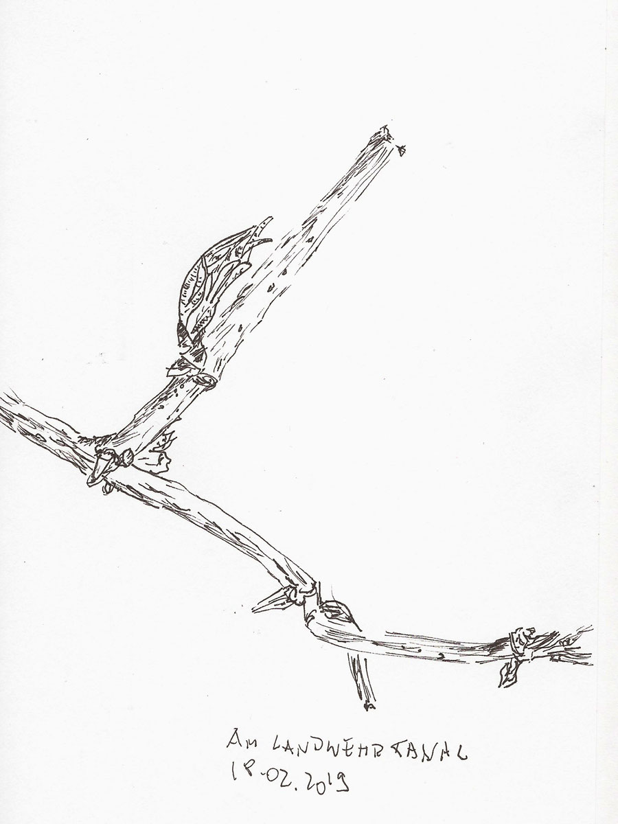 Die obere Zeichnung zeigt einen knospenden Strauch, den ich heute am Landwehrkanal / Tiergarten Berlin zeichnete. Ich habe zwar so einen Ahnung, um welchen Strauch es sich hier handelt, will aber nichts falsches schreiben und schweige mich hier aus.