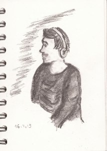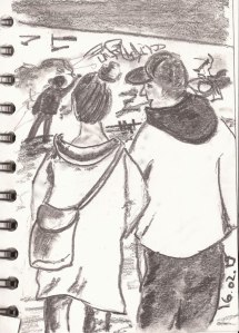 Klar, dass hier bei schönem Wetter etliche Menschen flanieren, gucken, fotografieren. Oder mitten im Trubel auf einer Bank sitzen und sich die Sonne ins Gesicht scheinen lassen. Da habe ich mir die Gelegenheit für ein paar Zeichnungen nicht entgehen lassen. Zwei zeige ich hier – die Kontraste habe ich zu Hause mit einem weichen Bleistift noch einmal nachgearbeitet.