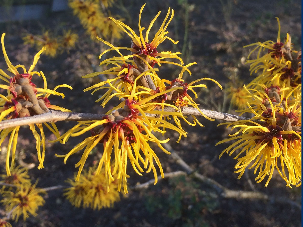 Da der Strauch jetzt, im späten Winter blüht, und nicht wie z.B. >>HIER<< beschrieben im Herbst, wird es sich wohl um einen Zierstrauch, die spätblühende Zaubernuss, handeln und nicht um die Heilpflanzenvariante Virginische Zaubernuss (Hamamelis virginiana) handeln.