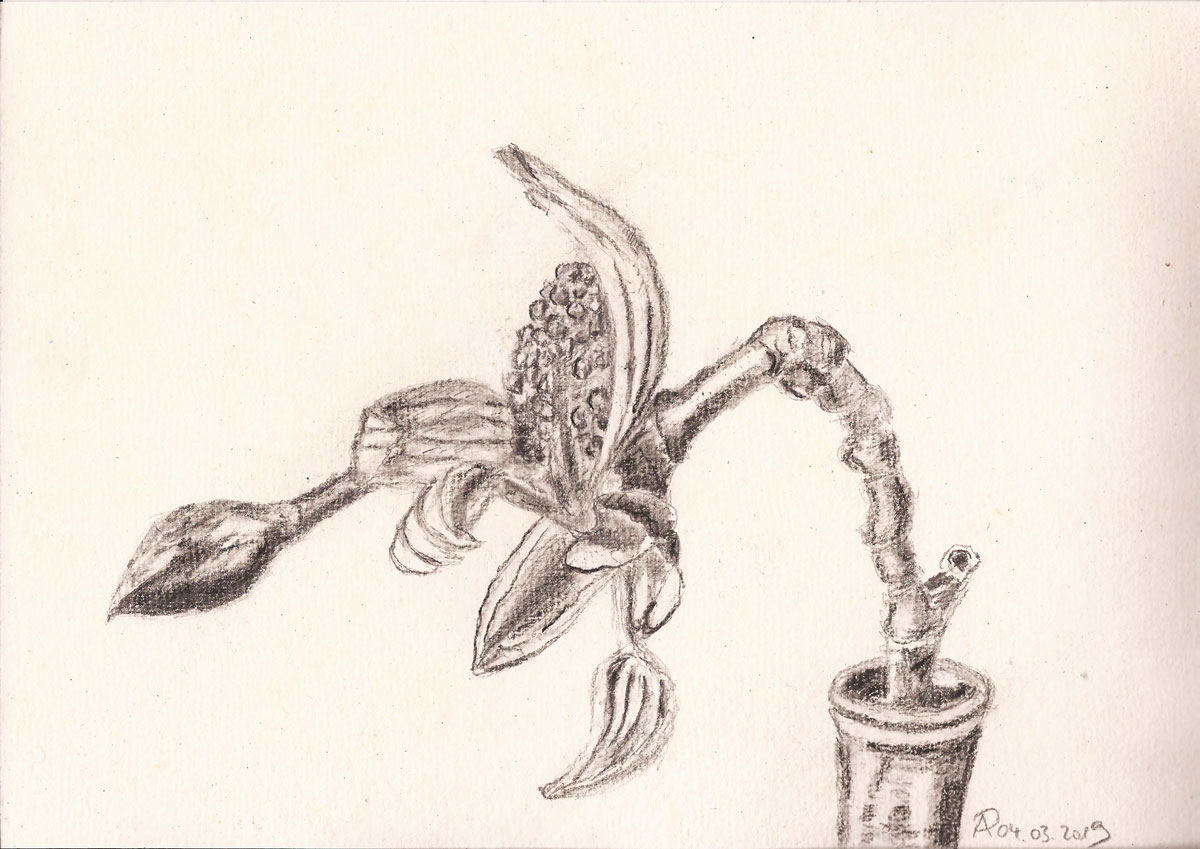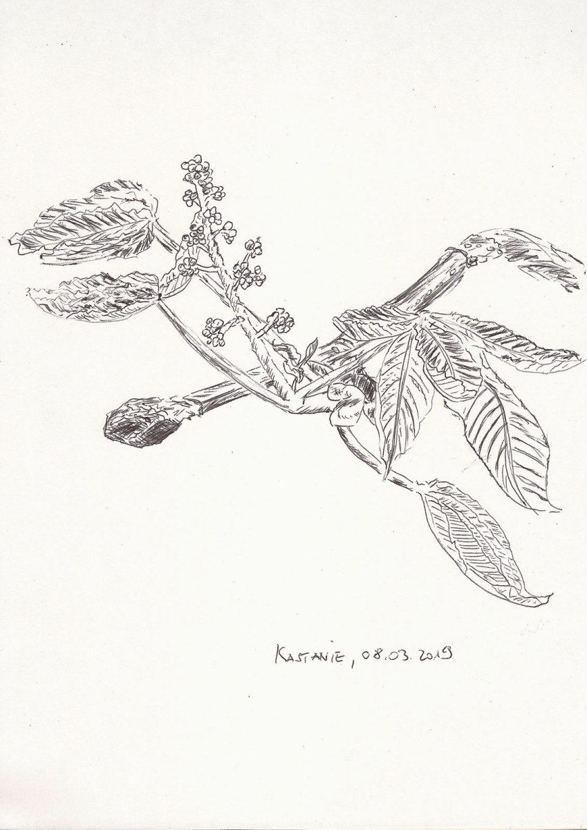 Nein, in Berlin sind die Kastanien noch nicht so weit wie auf diesen Zeichnungen. Das Motiv für diese Zeichenübung steht vielmehr in einer Vase bei mir zu Hause , wo ich staunend Tag für Tag beobachte, wie schnell sich die Knospe entwickelt. … was ich natürlich auch zeichnerisch festhalte.