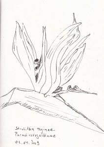 Strelitzie, Blüte, Zeichnung mit Fineliner, Notizbuch A5, 01.04.2019