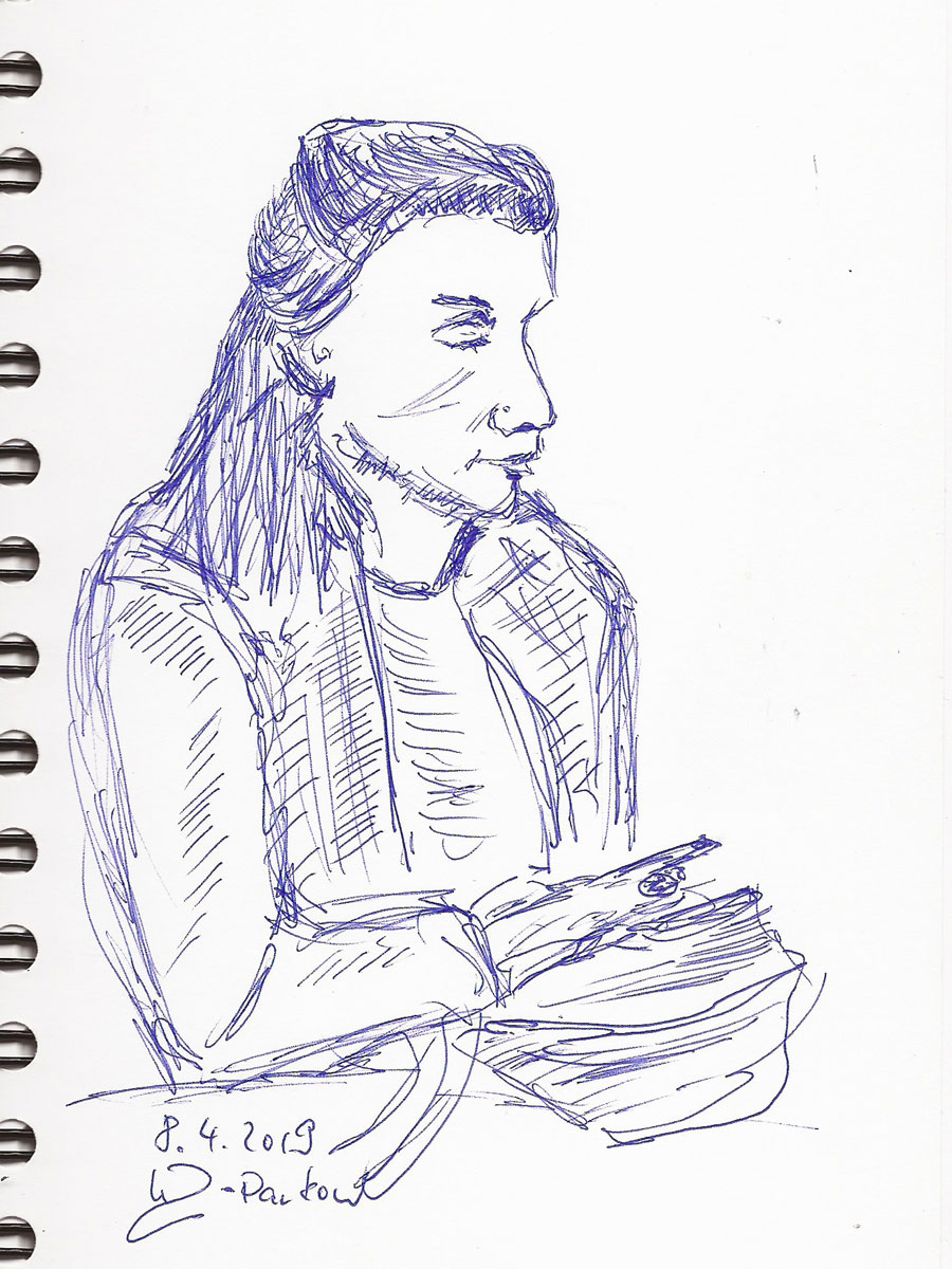 S-Bahn-Skizzen, Skizzenbuch 18.5*13cm, Kugelschreiber, 8.4.2019 April 11, 2019 S-Bahn-Skizzen (57). Nach einer Pause 900 × 1200 S-Bahn-Skizzen, Skizzenbuch 18.5*13cm, Kugelschreiber, 8.4.2019