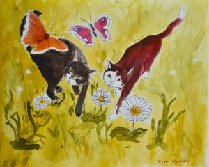 Zwei Kätzchen auf Entdeckung, Tusche au Aquarellpapier 24*30 cm, April 2019
