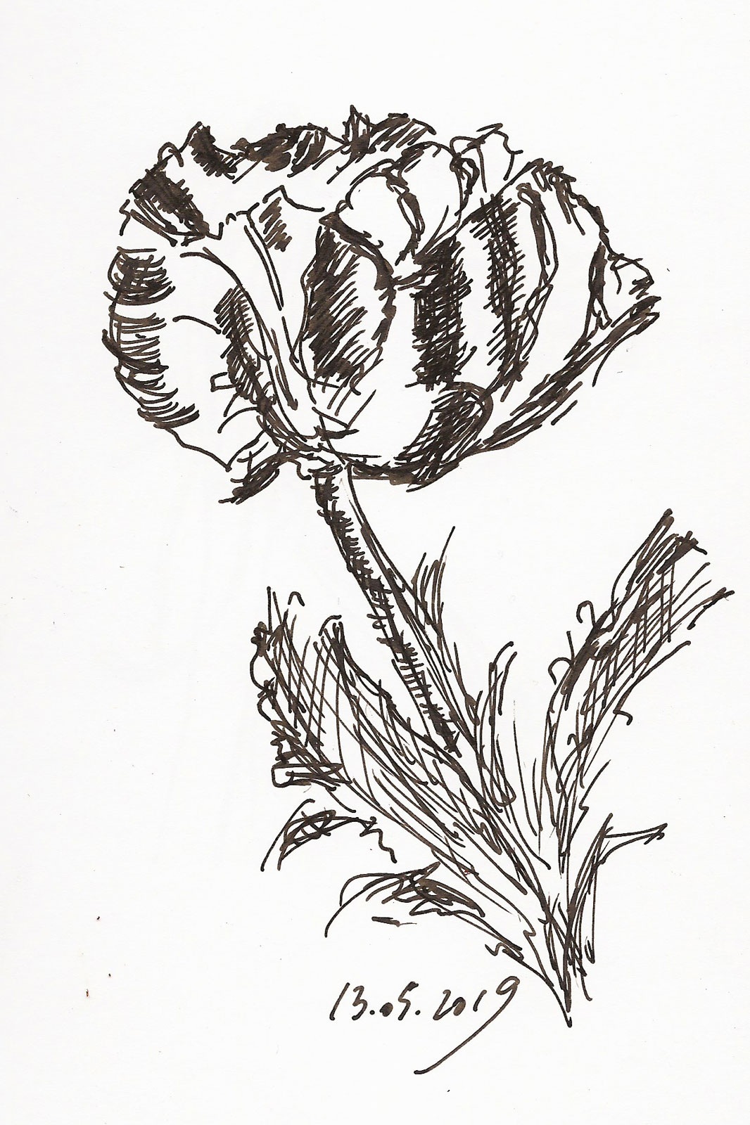 201905013_mohn-1BGAussch Mai 14, 2019 Gartenskizzen: Mohn und Tulpe 1066 × 1600 Die erste Mohnblüte im Garten, Skizzenbuch 13*18,5 cm, Tuschestift; Blattausschnitt