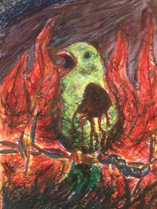 Waldvöglein, Ölkreide auf Papier, ca. 40*50 cm; Juni 2019