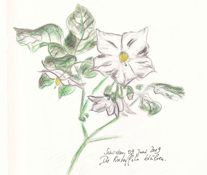 Ich bücke mich. Die Kartoffeln blühen ja schon! Weithin sichtbar sind sie nicht, die zarten weißen Blüten, doch wenn man genau hinsieht, sind sie von betörender Schönheit. Statt den Boden zu hacken und zu jäten, knie ich mich mit Skizzenbuch, Bleistift und ein paar Buntstiften zwischen die Kartoffelfurchen. Heute wird mein Maltag, beschließe ich, und beginne mich langsam zu entspannen. Die Gartenarbeit läuft nicht davon; das sogenannte Unkraut wartet auch noch bis zum nächsten Tag.