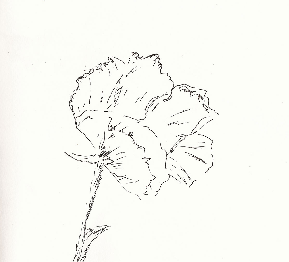 Eine weitere Zeichnung dieses Mohnensembles hatte ich noch einmal mit Fineliner anfertigen wollen, doch an jenem Tag hatte ich wohl die Ausstrahlung einer Regenfee: Wann immer ich mich zum Zeichnen niederließ, dauerte es nicht lange, bis die ersten Regentropfen fielen. Eingedenk des letzten Dürresommers und der riesigen Waldbrände, die wir in Brandenburg bereits jetzt hinter uns haben, nahm ich die Regenschauer mit wohlwollendem Humor und beließ es mit einer einsamen einzelnen gezeichneten Blüte.