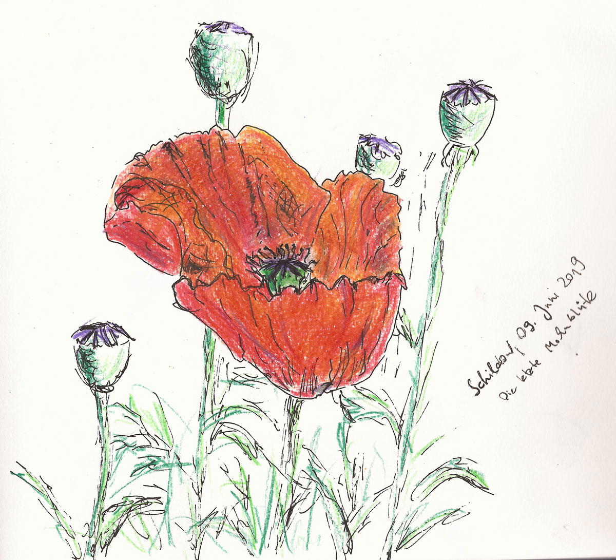 Dass es am Pfingstwochenende immer noch Mohn zu zeichnen geben würde, hatte ich gar nicht zu hoffen gewagt. Jedoch: eine letzte Blüte schien tapfer auf mich gewartet zu haben. Am Abend nach dem Zeichnen ließ dann auch sie ihre Blütenblätter fallen . Ich zeige Euch diese letzte Mohnblütenzeichnung dieses Jahres, auch wenn meine liebste Kunstkritikerin beim Durchblättern des Skizzenbuches kommentierte: Geht in Ordnung, kannste aber besser :-) .